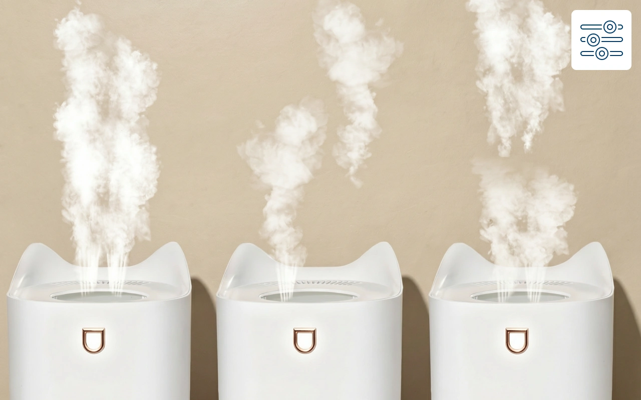 Vous pouvez contrôler l'intensité en choisissant entre les modes continu, intermittent ou alterné. Cette flexibilité garantit que le niveau d'humidité optimal est toujours maintenu.