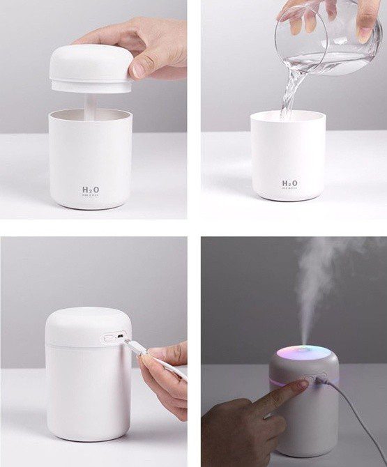 Installer ce purificateur d’air est simple. Remplissez le réservoir d’eau de 300 ml, branchez la prise USB à une source d’alimentation et allumez avec un simple bouton On/Off. Vous pouvez également changer les réglages de brume et activer la lumière d’ambiance ou de nuit changeante par une pression longue. Une solution super simple, pratique et efficace pour humidifier l’air chez vous ou dans votre espace de travail.